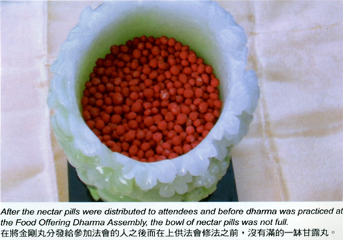 第一,当天坛城中央供奉著释迦牟尼佛陀,佛陀上方供有原始报身佛多杰羌佛,佛陀右方是佛舍利,左方为莲花生大师。并供有鲜花、奇珍异果、各类型的西藏糌粑食品、香味四溢的奶酪等供品琳琅满目、鲜艳无比,供满三个案头,甘露则供在案头的正中央。上供之前将甘露丸装在玉钵里面的时候,甘露丸刚好与玉钵的较低的一边齐平,成为平满的一钵甘露丸,后来佛陀上师加持给参加上供法会的59人每人一些甘露丸之后,剩下的甘露丸比玉钵较低的一边还要要低1.5厘米左右。但是,自七点三分修法开始,到八点十分左右三业上供圆满时,看到在这一小时甘露没有减少也没有增长,就在这个时候,从来没有想到过的圣迹,突然发生了,甘露丸刹那暴涨,不但超过1.5厘米,涨平成了满钵堆成了弧形,而且已经冒超很高,圣迹展显,大家都惊喜若狂。
