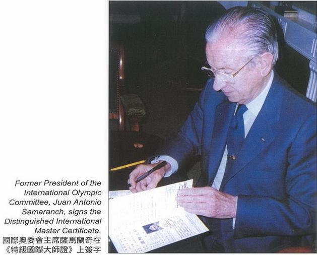 国际奥委会主席萨马兰奇在《特级国际大师证》上签字